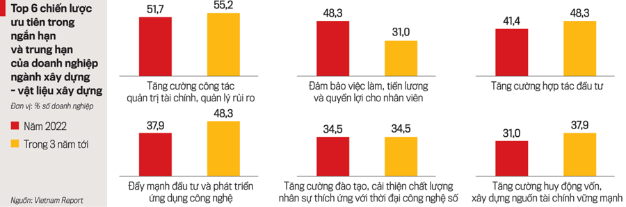 Trước bối cảnh như vậy, trả lời phỏng vấn báo chí, hầu hết các doanh nghiệp xây dựng – vật liệu xây dựng cho biết, trong ngắn và trung hạn, họ sẽ tập trung vào 6 ưu tiên sau: thứ nhất, tăng cường công tác quản trị tài chính, quản trị rủi ro; thứ hai, đảm bảo việc làm, tiền lương và quyền lợi cho nhân viên; thứ ba, tăng cường hợp tác đầu tư; thứ tư, đẩy mạnh đầu tư và phát triển công nghệ; thứ năm, tăng cường đào tạo và cải thiện chất lượng nguồn nhân lực thích ứng với thời đại số; thứ sáu, tăng cường huy động vốn, xây dựng nguồn tài chính vững mạnh. Qua đó, tạo lợi thế cạnh tranh cho doanh nghiệp trong gian đoạn mới.